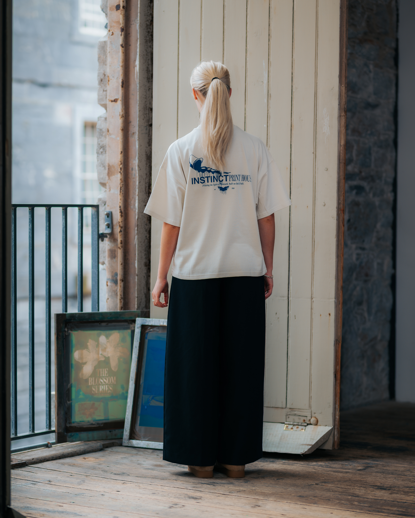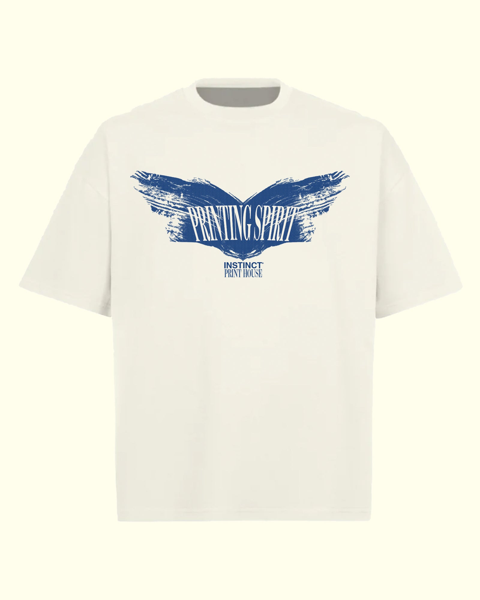 This vintage white T-shirt is constructed with our 100% organic cotton jersey, showcasing the 'printing spirit' artwork in a deep blue ink. The piece features a drop shoulder sleeve with a boxy oversized silhouette with our original artwork to the front and the back of the garment.