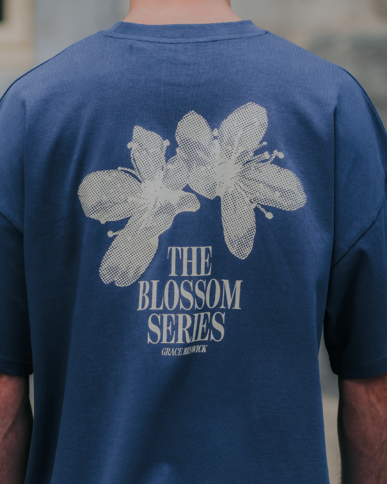 This navy T-shirt is constructed with our 100% organic cotton jersey, and is showcasing an original artwork called 'The Blossom Series', by Plymouth print maker, Grace Beswick. The piece features a drop shoulder sleeve with a boxy oversized silhouette.
